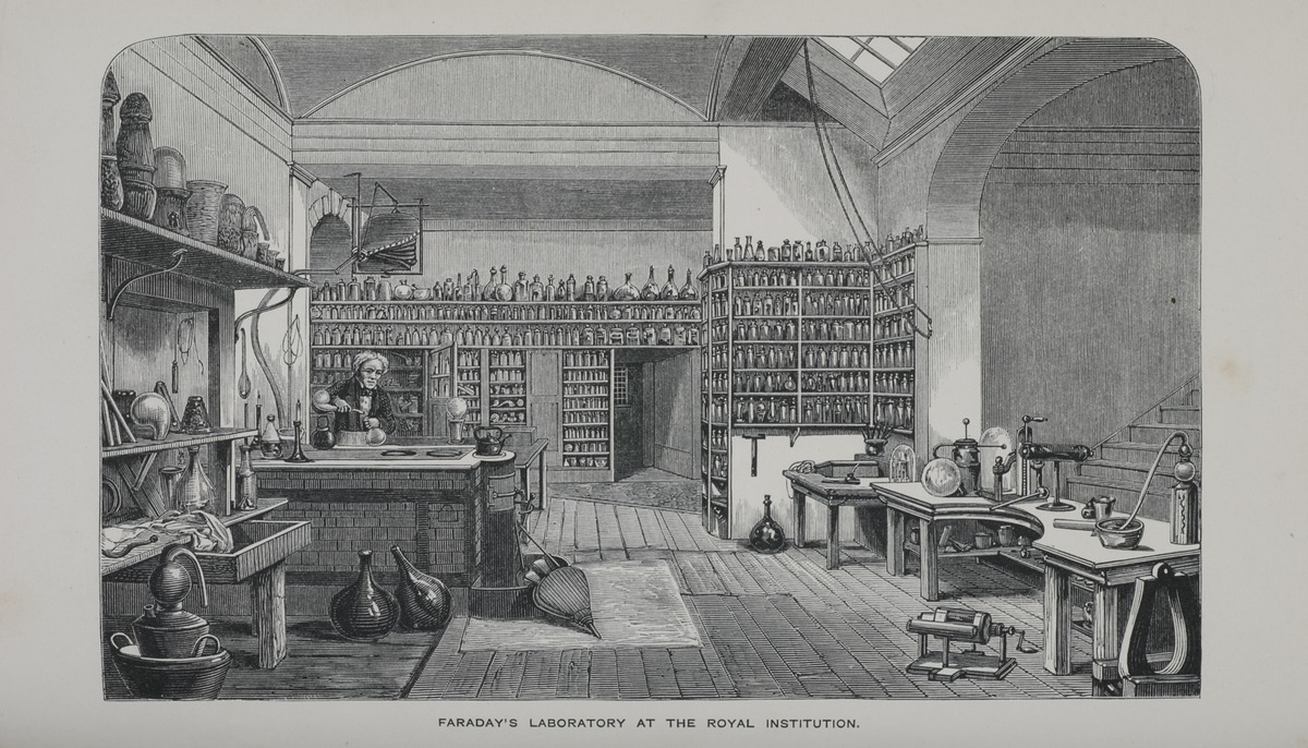 Picture engraving below is Michael Faraday's lab at the Royal Institution